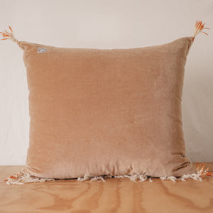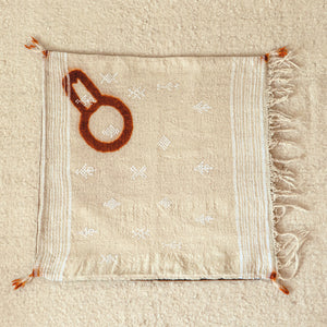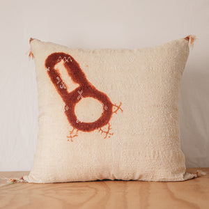 The Berber floor pillow collection is crafted from beautiful Berber bridal scarves from Morocco. Handwoven and adorned with henna motifs and tainted corners by brides-to-be in preparation for their traditional tribal marriage ceremony. This arrangement of motifs and use of henna was powerfully expressive in such that it was symbolic to their tribe with magical and talismanic meaning. The most common symbols used surrounded fertility and magical powers. Also, the use of henna on the bridal scarf signified a "divine blessing" and affirmed a life of protection from the evil eye as they began a new life of marriage.